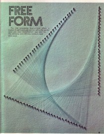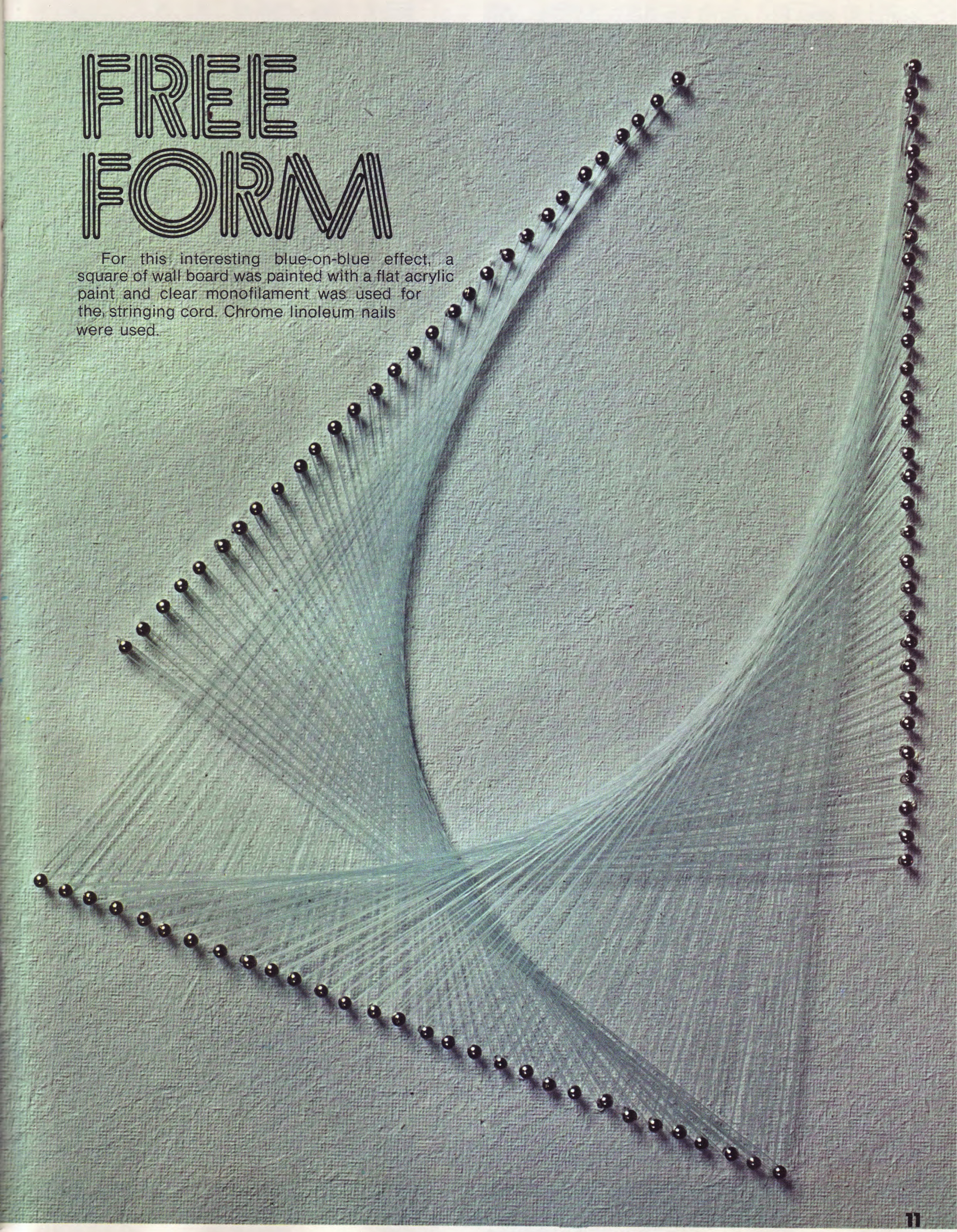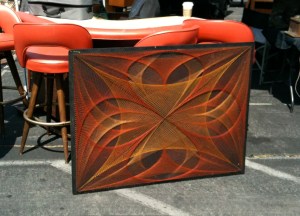 There are resources all over the internet for this technique & I think my favorite is a *.pdf instruction sheet that appears to be for a string art merit badge.  I like it because it goes into how the technique works and allows for more flexibility & creativity so that you can design your own instead of following patterns.  It also covers basics like tying off, etc.  I’m actually going to use it’s “more complex triangles” example for my third piece because it reminds me of a piece of string art I spotted at the Rose Bowl Flea Market June 2010 that I have been thinking about ever since.