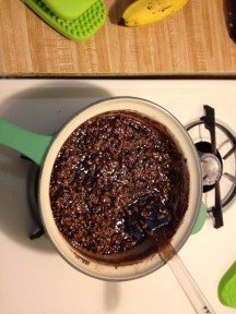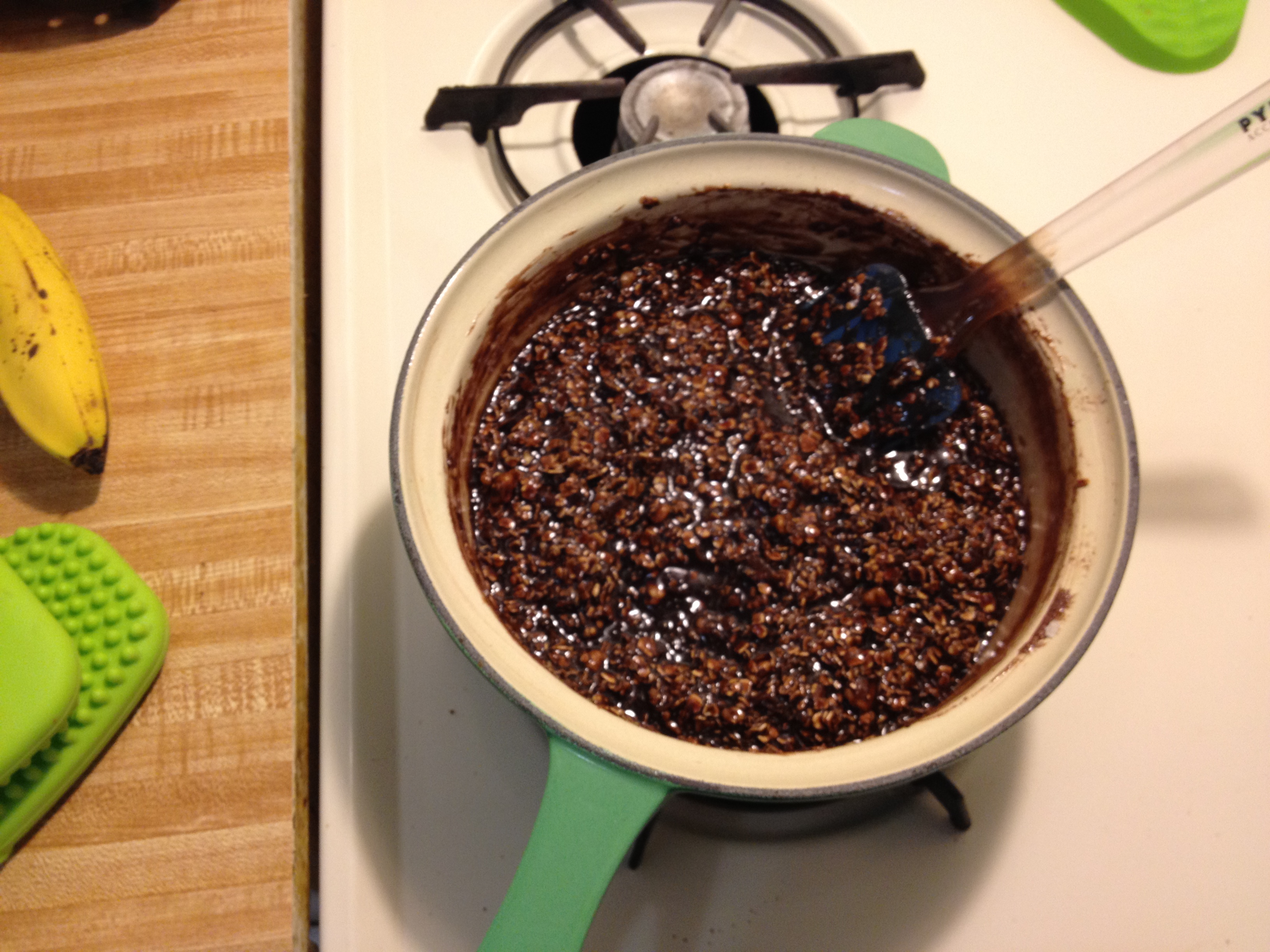 Boil this (full rolling boil) for 1 minute. Stir in oatmeal, coconut and nuts.