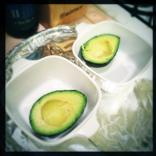 Halve the avocado. Remove the pit. I didn’t scoop out any extra to make room for the eggs, but perhaps I should have…
